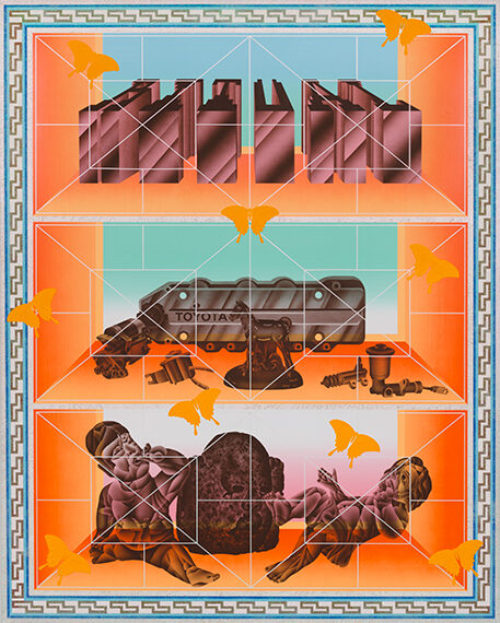 - Jaime Muñoz, LKQ Pick-A-Part, 2020, Acrylic, airbrush, glitter, and flocking on wood panel, 60” x 48” inches, Collection of Ben and Monika Wiener, ©Jaime Muñoz, Used with permission, all rights reserved.